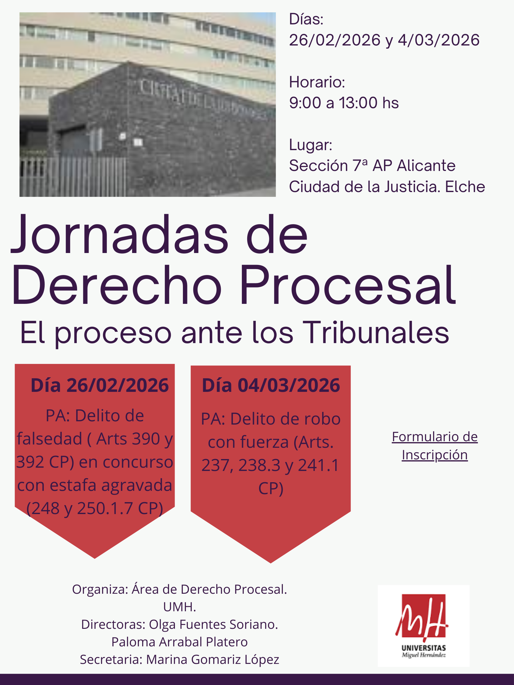 Estas Jornadas fueron organizadas por el Área de Derecho Procesal de la Universidad Miguel Hernández con la participación de las Profesoras Arrabal Platero y Gomariz López, bajo la dirección de la Profa. Fuentes Soriano.