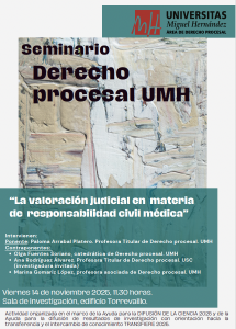El área de Derecho procesal de la Universidad Miguel Hernández organizó el pasado viernes 14 de noviembre de 2025 un seminario interno sobre la «La valoración judicial en materia de responsabilidad civil médica». La actividad se celebró en la Sala de Investigación del edificio Torrevaíllo.